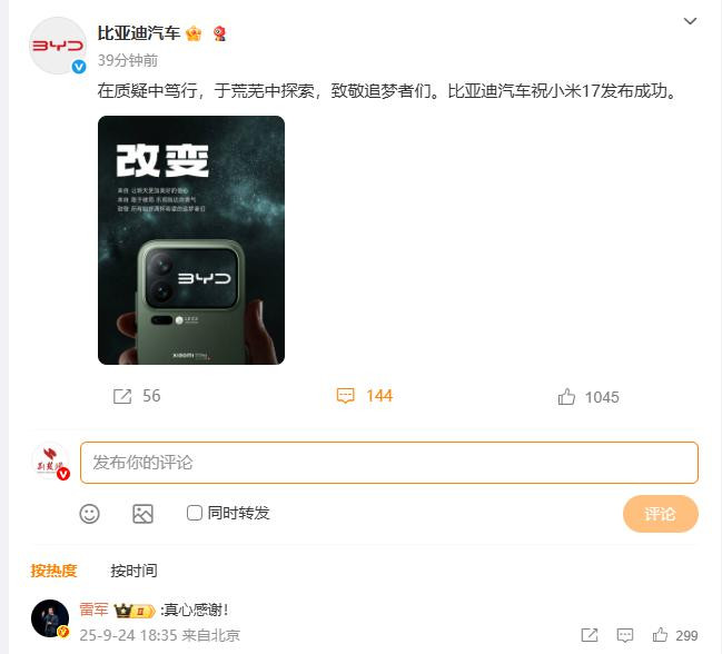 今日(9月24日)晚间,@比亚迪汽车官方微博发文,预祝明天晚间发布的小米17系列手机成功长盈策略,官方写道:“在质疑中笃行,于荒芜中探索,致敬追梦者们。比亚迪汽车祝小米17发布成功。”