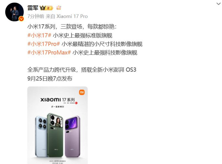 9月22日,小米董事长兼CEO雷军在社交平台发布消息,小米17系列将于9月25日晚7点正式发布,共推出三款机型:小米17、小米17Pro、小米17ProMax。